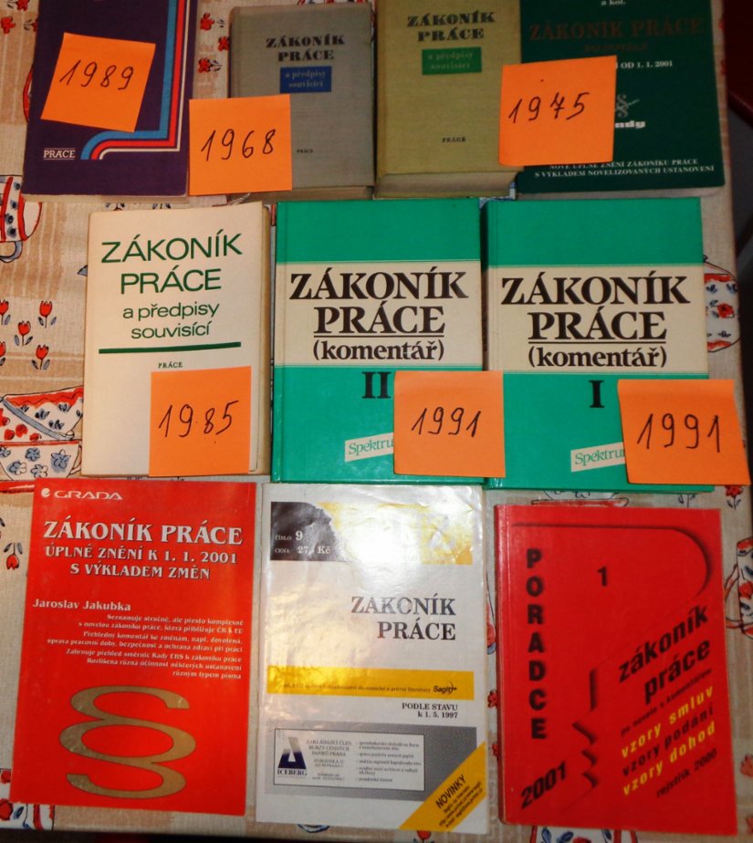 10 knih vydání Zákoníku práce, vydání rok 1968 = 515 stran, vydání rok 1975 = 605 stran, vydání rok 1985 = 457 stran, vydání rok 1989 = 285 stran, vydání rok 1991 = I + II díl, vydání rok 1997, vydání rok 2001 od L. Jouzy = 255 stran, vydání rok 2001 od J. Jakubka a vydání rok 2001 od M. Kubínkové = 297 stran, všechny knihy po 40 Kč / ks nebo všech 10 ks celkem za 350 Kč + přepravné.
