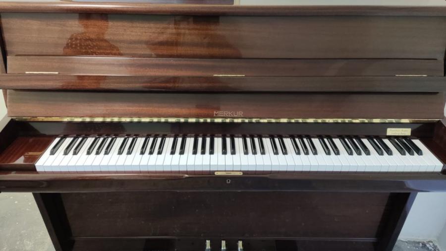 Zánovní pianino Merkur německé výroby, model 112 (cm), výška. Pianino je určeno pro začátečníka, ale i pro pokročilého hráče. Málo používané, mechanika a klávesnice, jako nové. Výborný zvuk i dynamika klávesnice. Polyester vysoký lesk. Odborný dovoz zajistím.