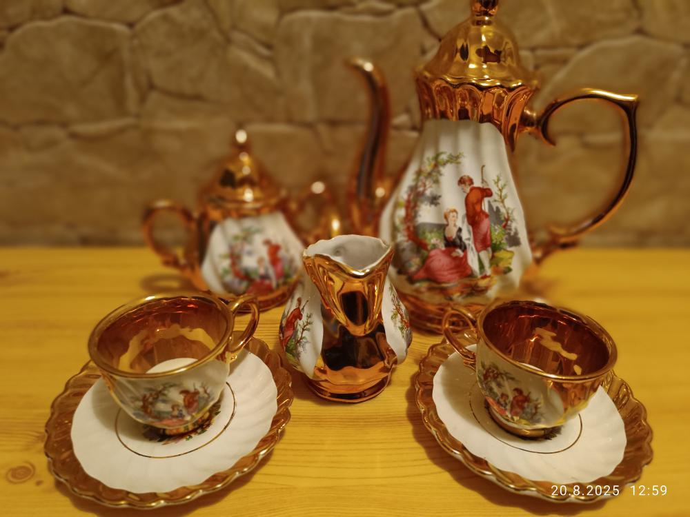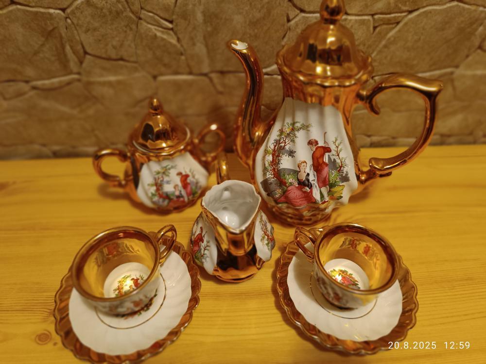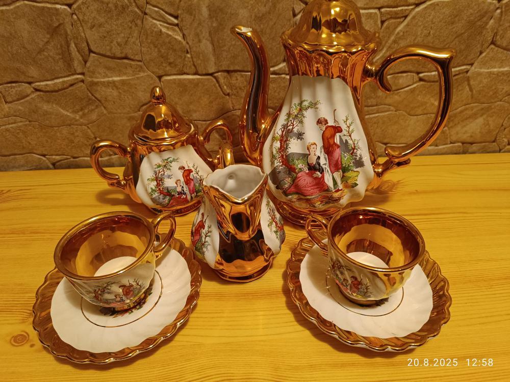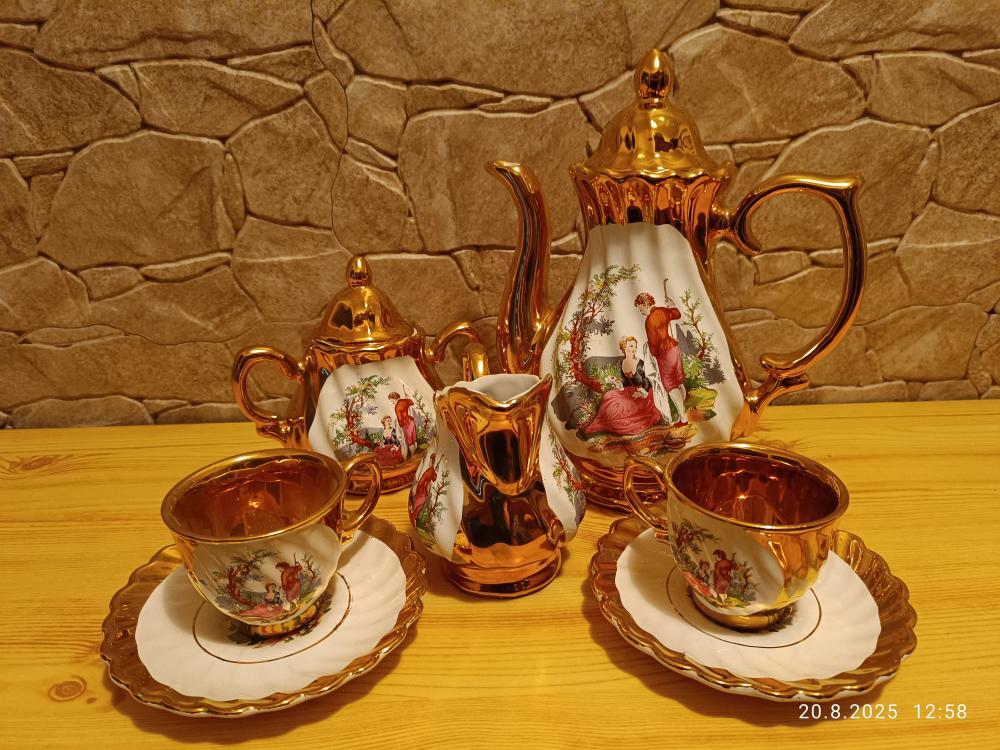 Motivem dekoru této čajové soupravy na bílé ploše jsou 2 postavy- milenci, který je doplněn bohatým jemným zdobením zlatem.