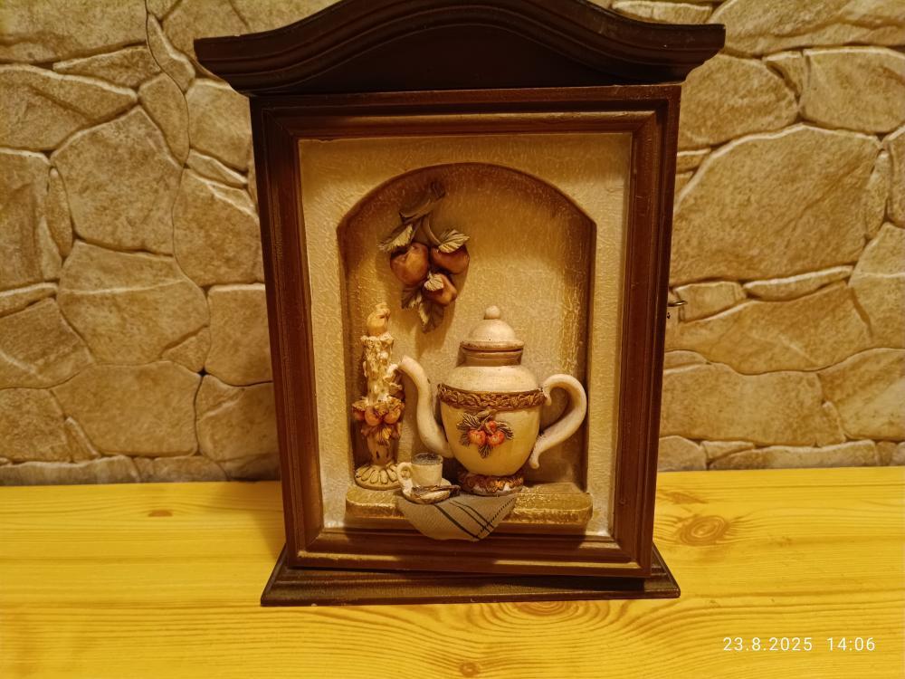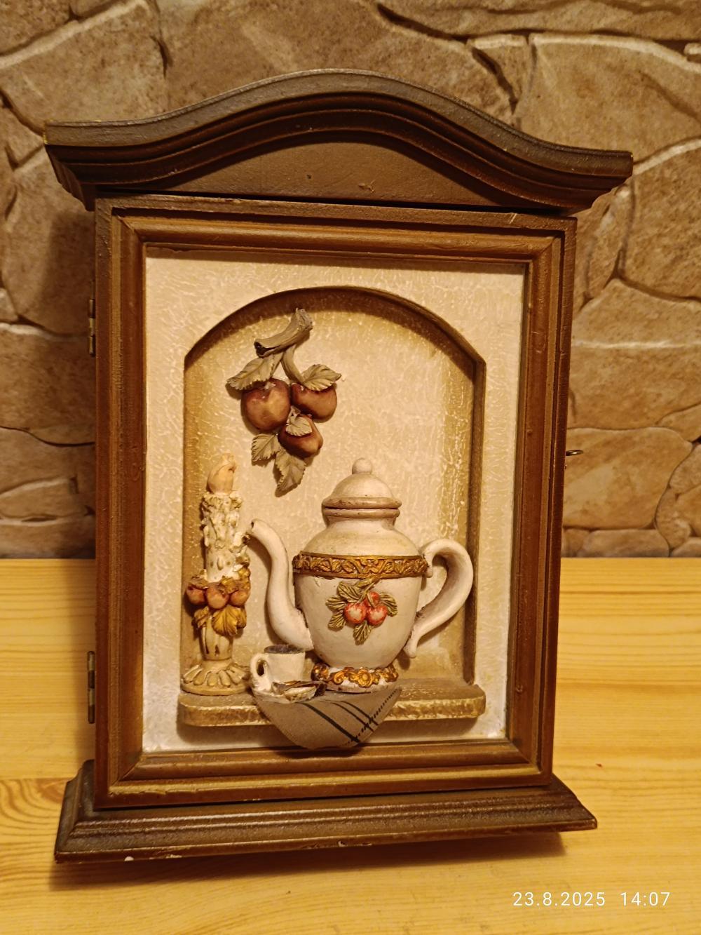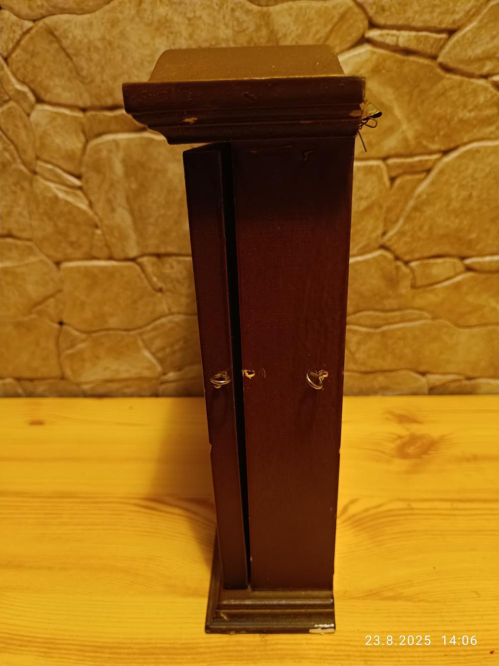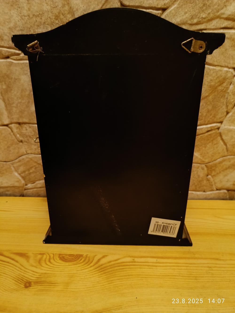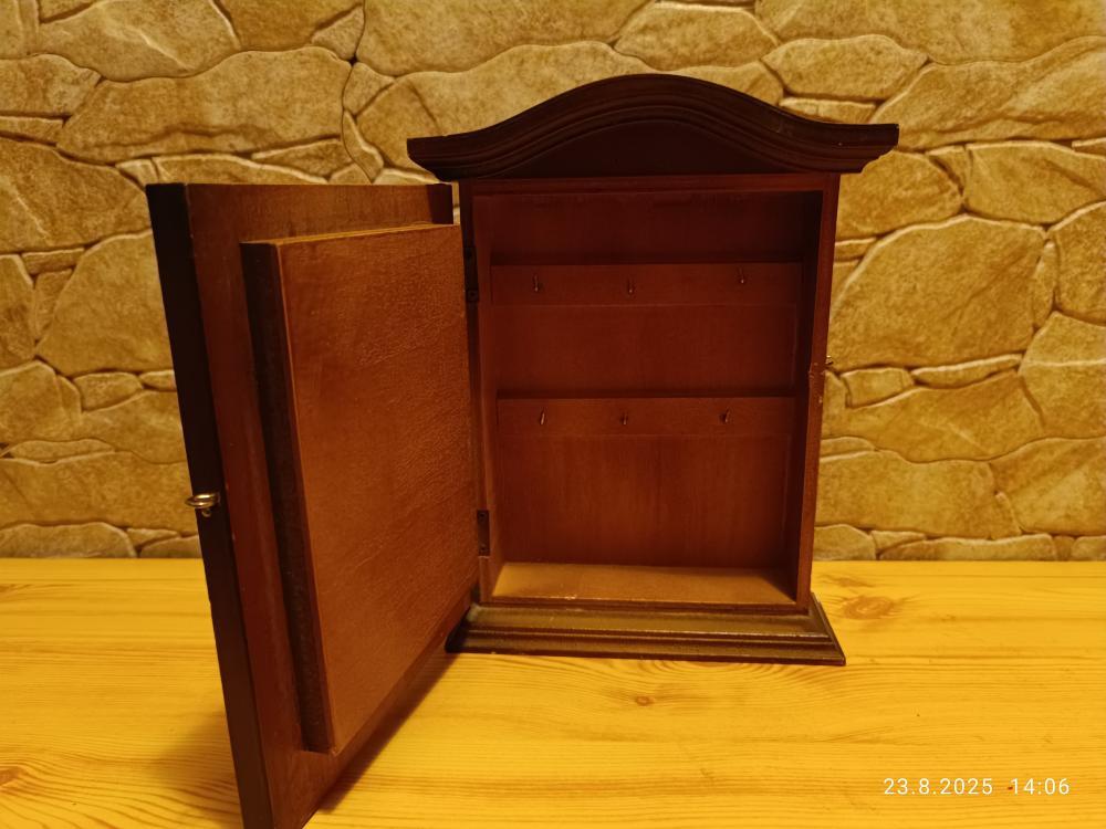 Prodám dřevěnou závěsnou vykládanou schránku na 6 svazků klíčů. Výše 25,5 cm, šířka cca.19 cm. Používané, místy lehce odřené. Preferuji odběr Plzeň.