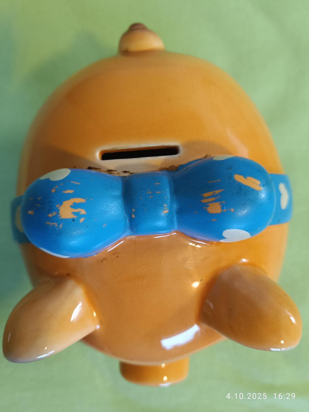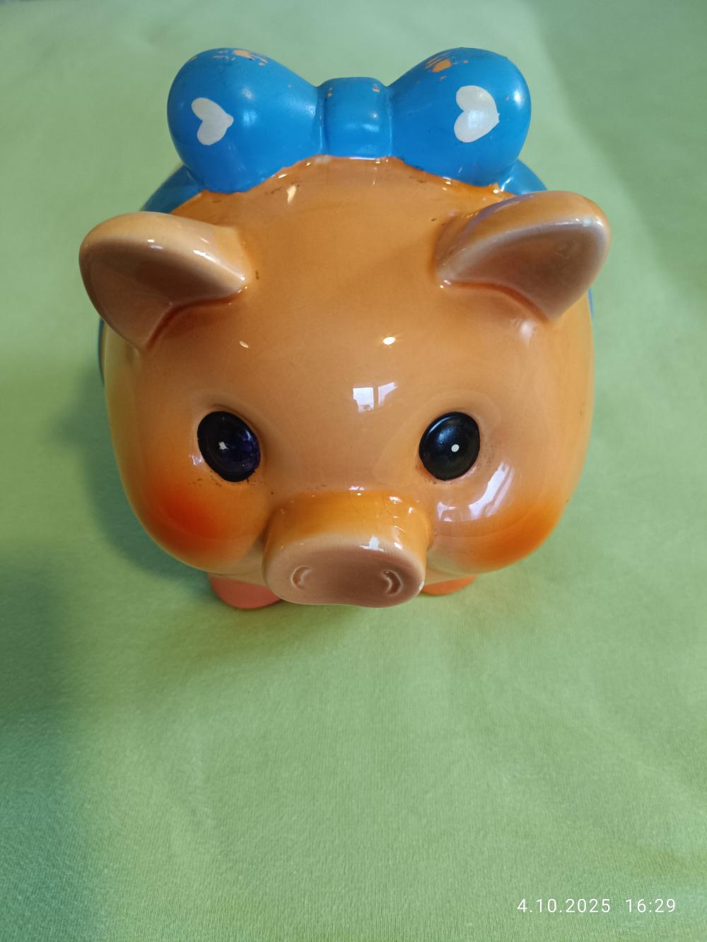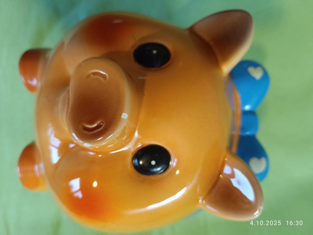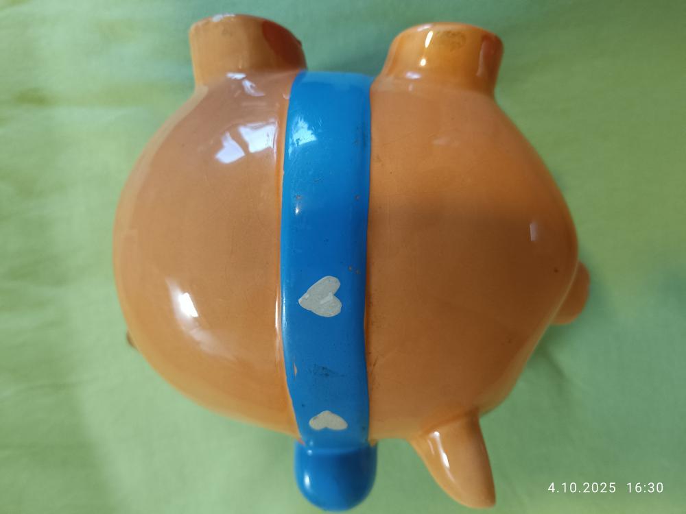 Prodám keramickou pokladničku prasátko oranžovo bílo modré Na dně pokladničky otvor pro výběr peněz - tedy je na opakované použití, vyrobena z kvalitní keramiky. Pokladnička je pevná, odolná a bezpečná, rozměry cca. délka 17 x výše 15,5cm. Nejlépe osobní odběr Plzeň