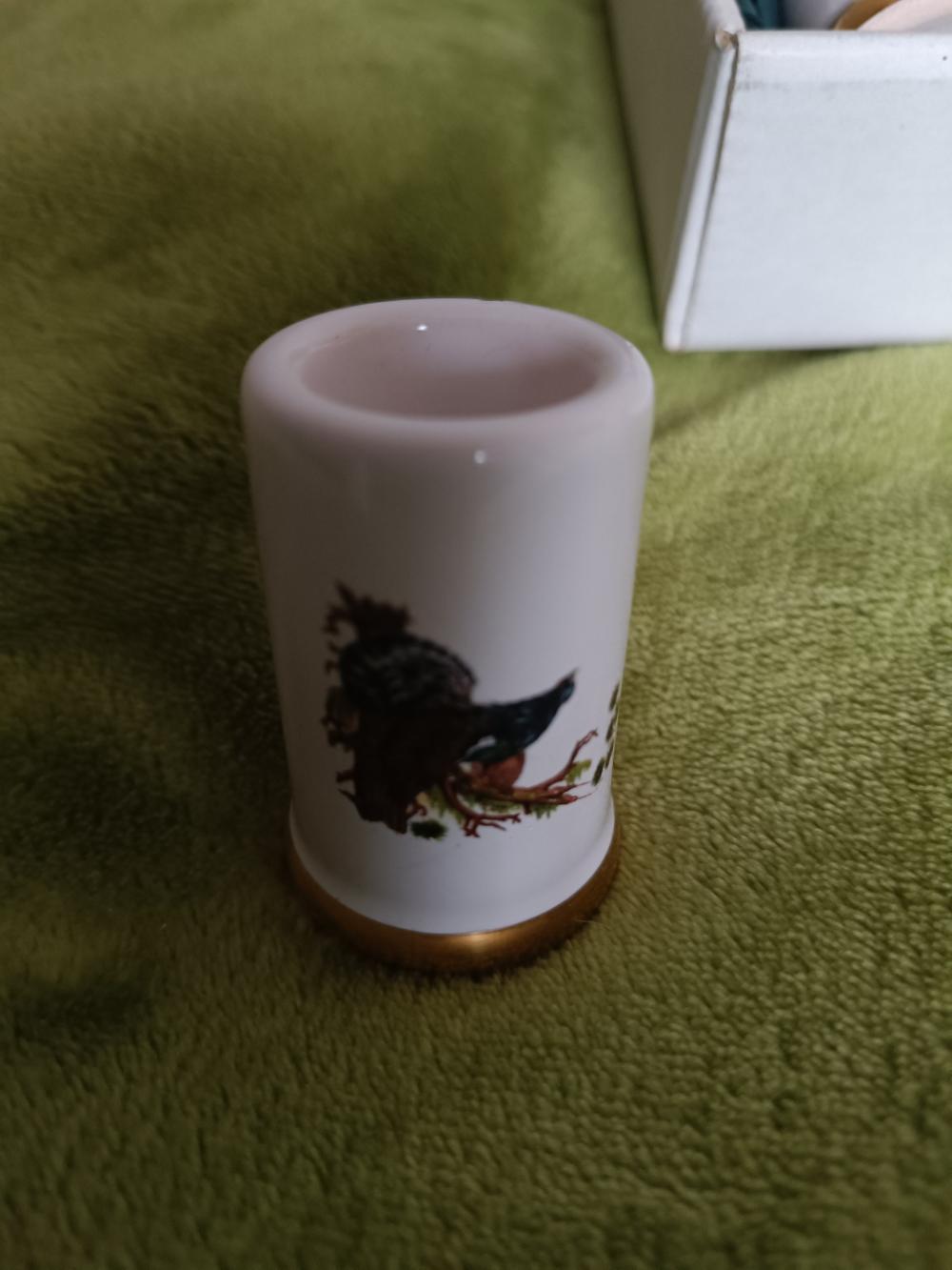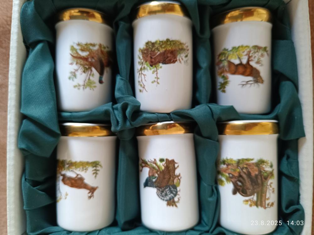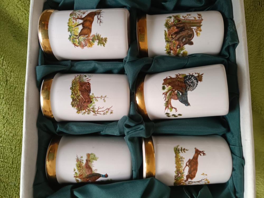 Prodám keram.soupr.pohárků s lov.motivy 6 ks na „panáky“ Keramická souprava s loveckými motivy v dárkovém balení Originální horácká keramika v balení 6 pohárků (0,04 l),“panáků“ výše cca.5,5 cm ve tvaru brokové nábojnice. Vystavené, nepoužívané. Plzeň MK plus